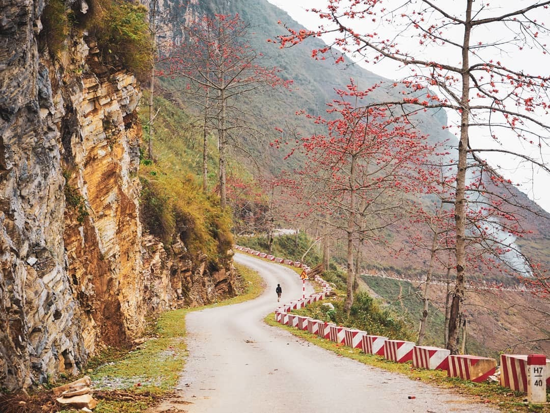 Với hai tuyến đường còn lại, bạn sẽ được chiêm ngưỡng vô số cây hoa gạo nở đỏ rực hai bên đường. Cung đường nhỏ hẹp, cheo leo bỗng chốc trở nên thật xinh đẹp, thơ mộng dưới sức ảnh hưởng của loại hoa thắm sắc này.